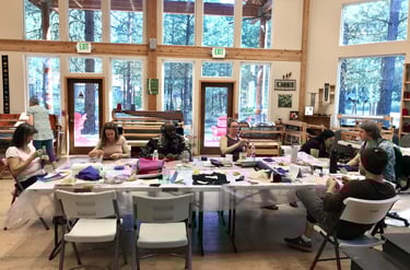We arrived at the Grunewald Guild where the retreat center was hidden in a small town called Plain. Imagine lots of cabins hidden in a wood. There were at least a dozen buildings, but our stay was at the fiber art studio with big front windows to receive natural light. The studio boasts weaving equipment and endless yarn. Our individual bedrooms were filled with beautiful art and this note of blessing by Mollie Taylor: