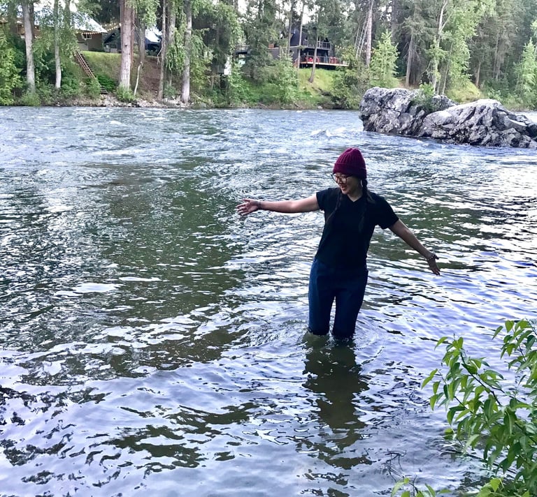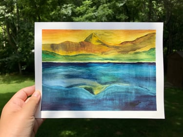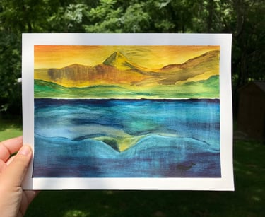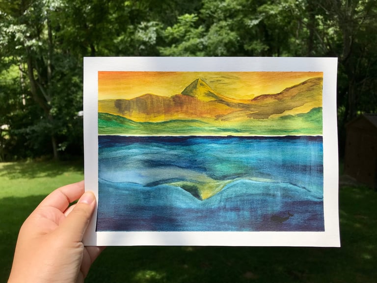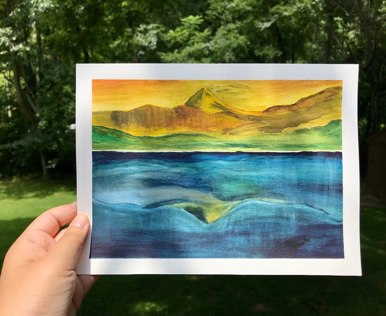 During the retreat, I felt God’s presence most through the river and water: the rolling water of nameless rivers along the way to the Guild; the Wenatchee River that flows beside the Guild. Through a painting of water as well I felt a strong pull from God. On the fifth day, our facilitator invited us for visio divina, the practice of asking God to speak through a piece of visual art, over a painting that the founder of Grunewald Guild, Richard Caemmerer, painted. This painting depicted a hill and its reflection over a calm, deep blue water. The sky was yellow, almost brown, puzzling to be dawn or sunset. The facilitator guided us to lay our eyes on the painting, place ourselves in the painting, and hear what the Spirit is telling us. I found myself buried beneath water. Mixed emotions - fear, alienation, lostness, isolation, gloom - flooded in that moment, which eventually charged me with desperation to be found by God. I felt confronted in disconnection from God but also assured in compassion of God. I have Creator of the Universe who meets me even underwater. Creator of the whale is after me. And as I kept staring, the painting suddenly placed me in Cheonji lake, a volcanic crater lake sitting on top of North Korea’s highest mountain, with the question, ‘How long, Lord? How long until You send my people in North Korea the Great Fish?’ Overwhelmed by questions and emotion, I ran back to my room, hid behind the closet, and cried for two hours. I wondered, ‘Either You will send the Great Fish, or make me walk on the water.’ With so many questions, I needed to make something. One of the artists let me borrow her watercolor supplies, so I went down to Wenatchee River and recreated the painting I saw. This process of watercoloring using the River water became a practice of embodying the Holy Spirit in my art.