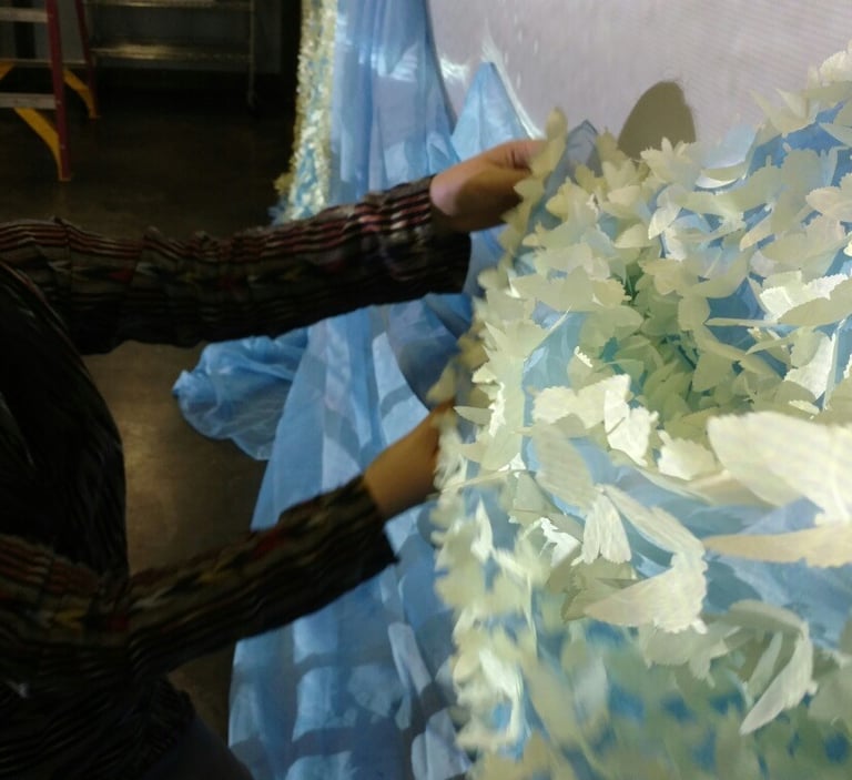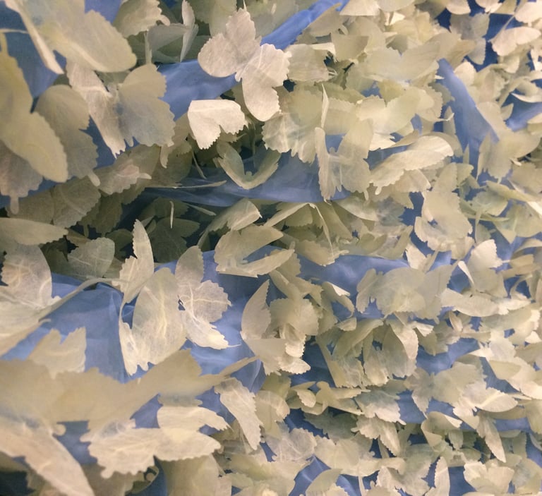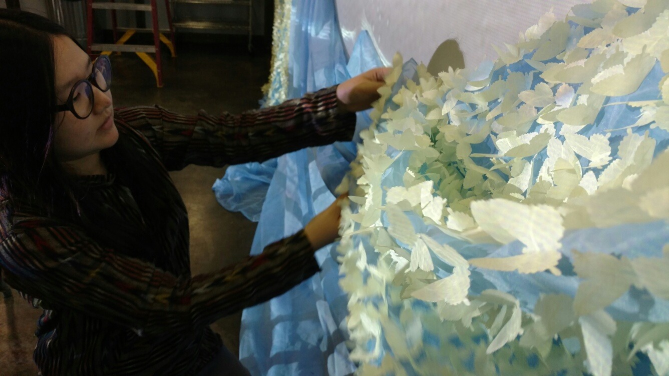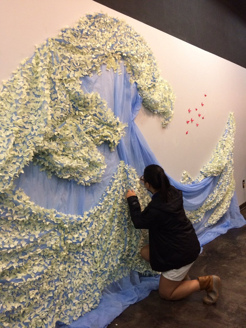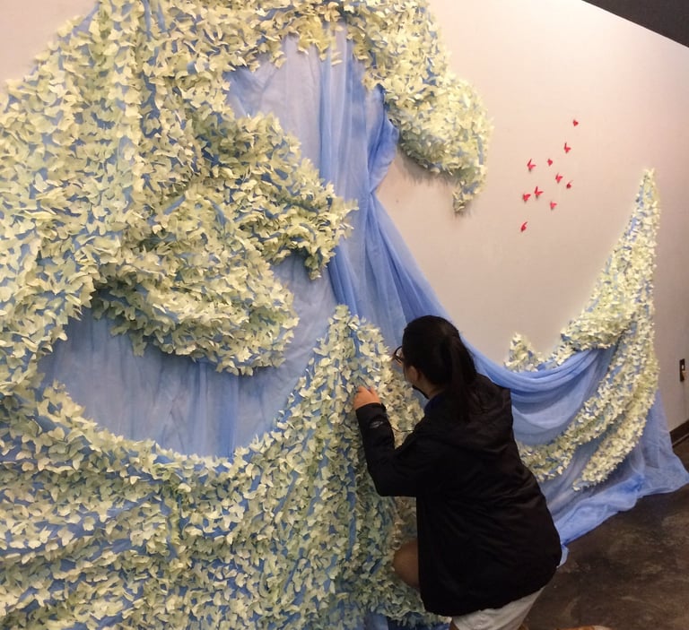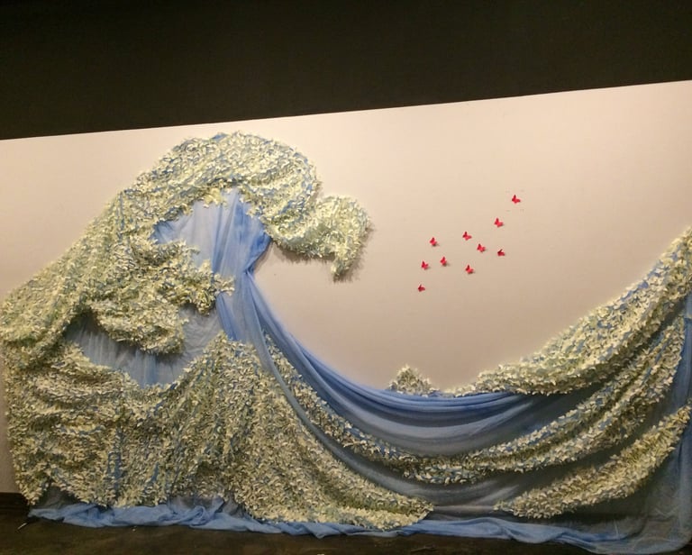 This work includes 10,000 butterflies created out of traditional Korean paper. Butterflies represent Korean comfort women, as they both are delicate and feminine. 9,990 yellow butterflies are attached to the blue fabric and stand for 99.9% of women who have remained silent concerning their experience. In Korea, the color yellow is traditionally used for funerals to allow spirits to rest in peace, and yellow provides hope. The red of 10 butterflies communicates the violence forced upon comfort women. These forms fly away from the oncoming wave and refer to the 0.1% of comfort women that boldly identified themselves as evidence of this horrible war crime. The installation takes the form of the famous Japanese print, The Great Wave by Hokusai.